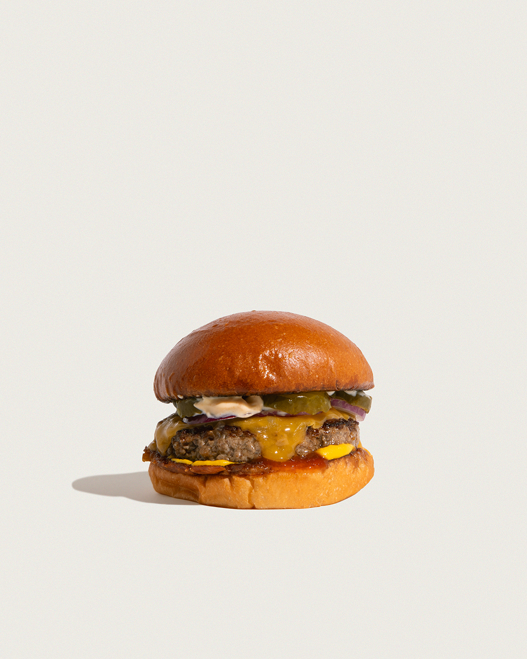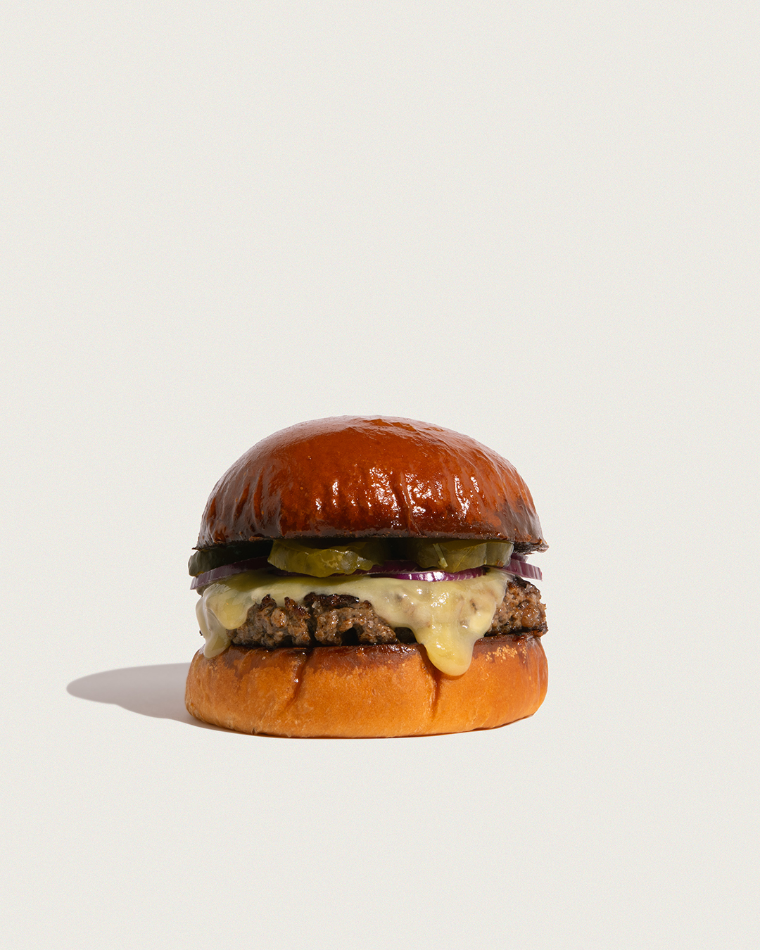 Økologisk burgerbolle, økologisk friskhakket dansk oksekød, ekstra smør, mature cheddar, pickles og rødløg.