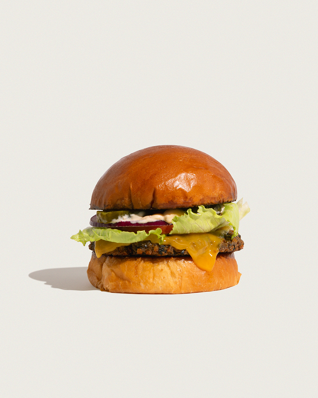 Økologisk burgerbolle, økologisk veggiebøf, svampe garum, cheddar, tomat, salat, rødløg, pickles & Jagger sauce.